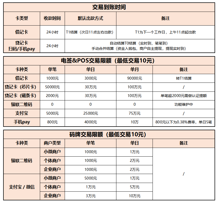 易生支付聚赢家POS机支持刷卡、扫码、闪付等多种交易方式。单笔限额5万,单日30万。如用户使用磁条卡交易系统提示限额,可到聚赢家公众号账户里面单独进行认证,提额之后再行刷卡。具体各个交易方式的限额标准如下表。